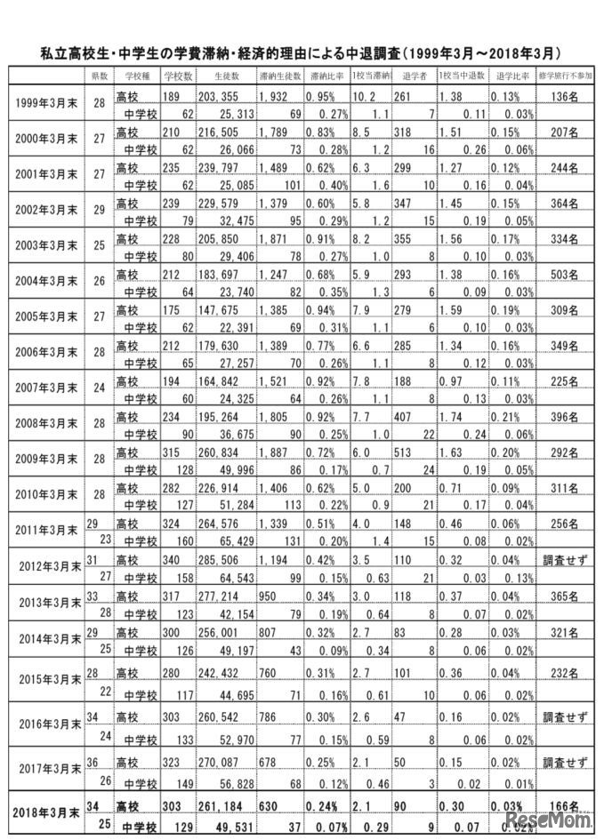私立高校生・中学生の学費滞納・経済的理由による中退調査(1999年3月~2018年3月)
