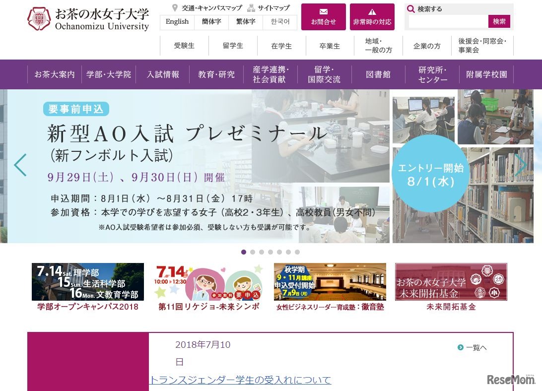 お茶の水女子大学は2018年7月10日、戸籍上男性であっても性自認が女性であるトランスジェンダー学生を受け入れると発表した。2020年度の学部および大学院の入学者から受け入れる。多様な女性があらゆる分野に参画できる社会の実現をめざす。