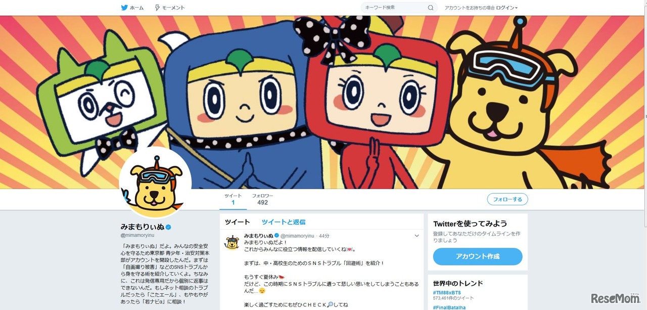 東京都は2018年7月12日、中高生によるスマートフォンのトラブルや犯罪を防ごうと、SNS配信を開始した。青少年・治安対策本部のキャラクター「みまもりぃぬ」と人気モデルが監修した「おたすけ団」が、中高生向けにSNSトラブル回避術を楽しく伝授していく。