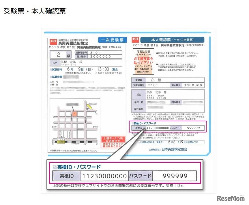 英検IDとパスワードの記載場所(受験票・本人確認票)