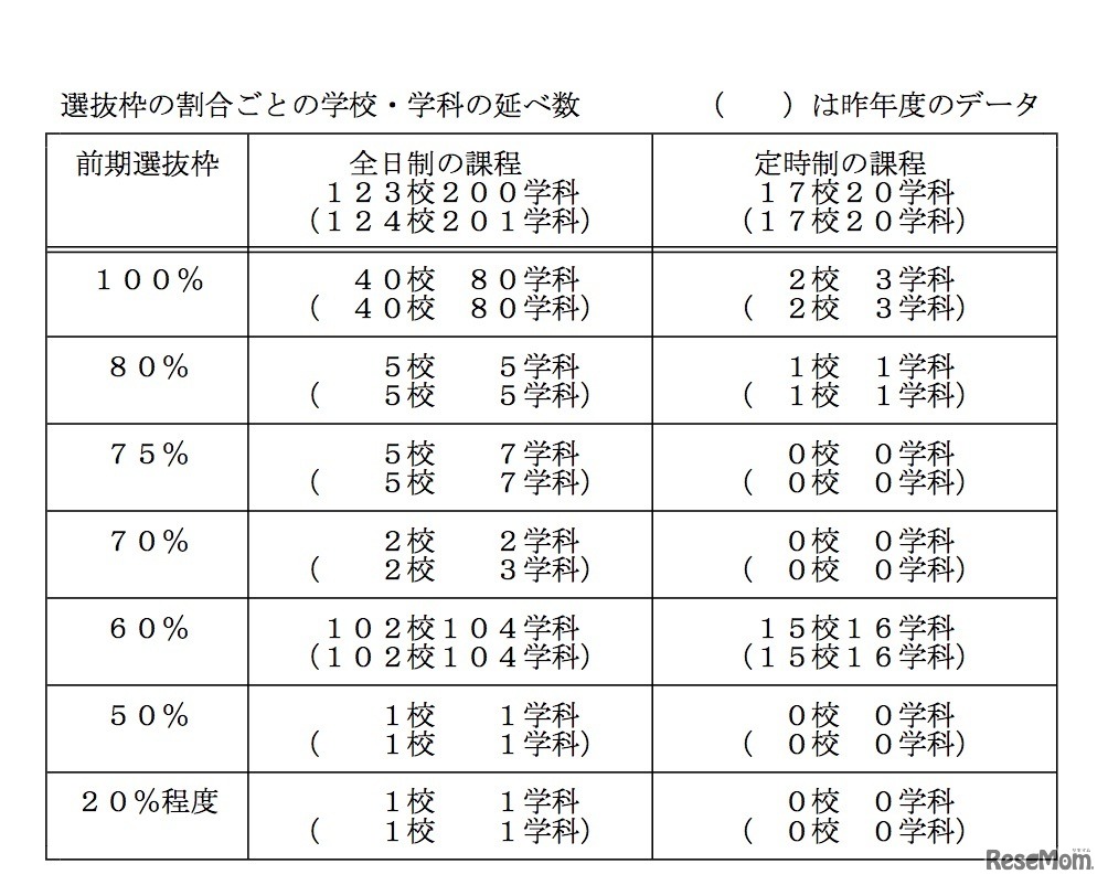 画像出典:千葉県教育委員会「平成31年度千葉県公立高等学校入学者選抜の検査の内容等について」 平成31年度千葉県公立高等学校入学者選抜 前期選抜「選抜枠の割合ごとの学校・学科の延べ数」
