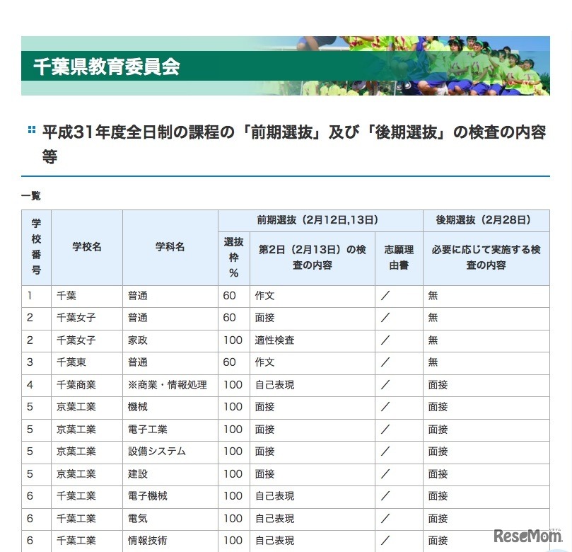 千葉県教育委員会は2018年7月13日、平成31年度(2019年度)千葉県公立高等学校入学者選抜における「学力検査の実施教科および出題方針」と「前期選抜・後期選抜等の検査の内容など」について公表した。