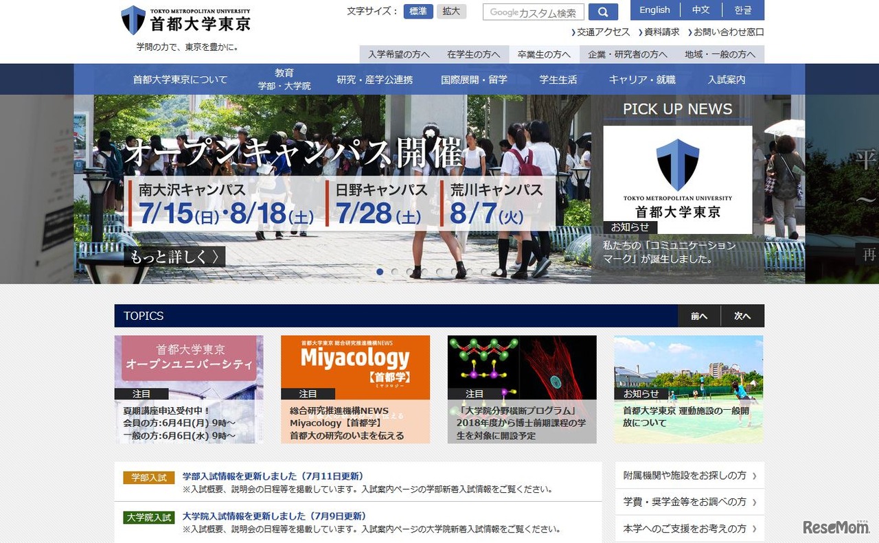 首都大学東京は、2018年7月12日の都政改革本部会議における小池百合子知事の発言について、対応を検討していることを明らかにした。小池知事は「都立の大学であることを都民にわかりやすく発信するため『東京都立大学』も1つの考え方としてある」などと述べた。
