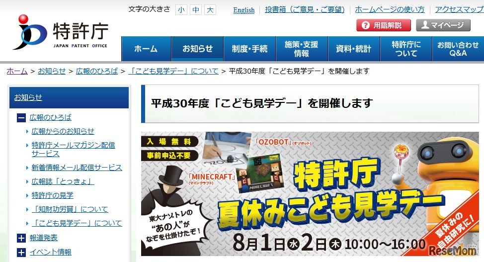 特許庁は、2018年8月1日と2日に「特許庁夏休みこども見学デー」を開催する。プログラミング体験、ロボットのデモンストレーションなど5つのプログラムを用意しており、事前登録不要で参加できる。時間は両日とも午前10時から午後4時。入場無料。