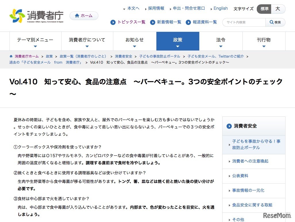 夏休みの時期は、子どもと一緒にバーベキューを楽しむという家庭も多い。消費者庁は2018年7月18日、バーベキューにおける食品の注意点を紹介。楽しいひとときが食中毒によって悲しい思い出にならないよう、安全ポイントのチェックを呼びかけている。
