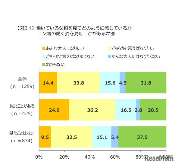 画像出典:アイデム「子どものキャリア観に関する意識調査」 働いている父親を見てどのように感じているか(父親の働く姿を見たことがあるか別)