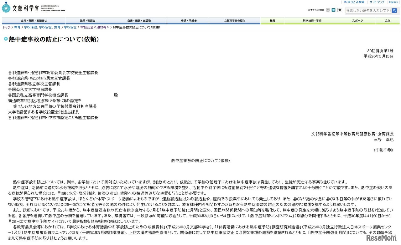文部科学省は2018年7月18日、各都道府県教育委員会や各学校などに対し、熱中症事故を防止するために万全の対策をするよう求める通知を出した。また、通知と合わせて熱中症事故防止の参考となる資料を紹介した。