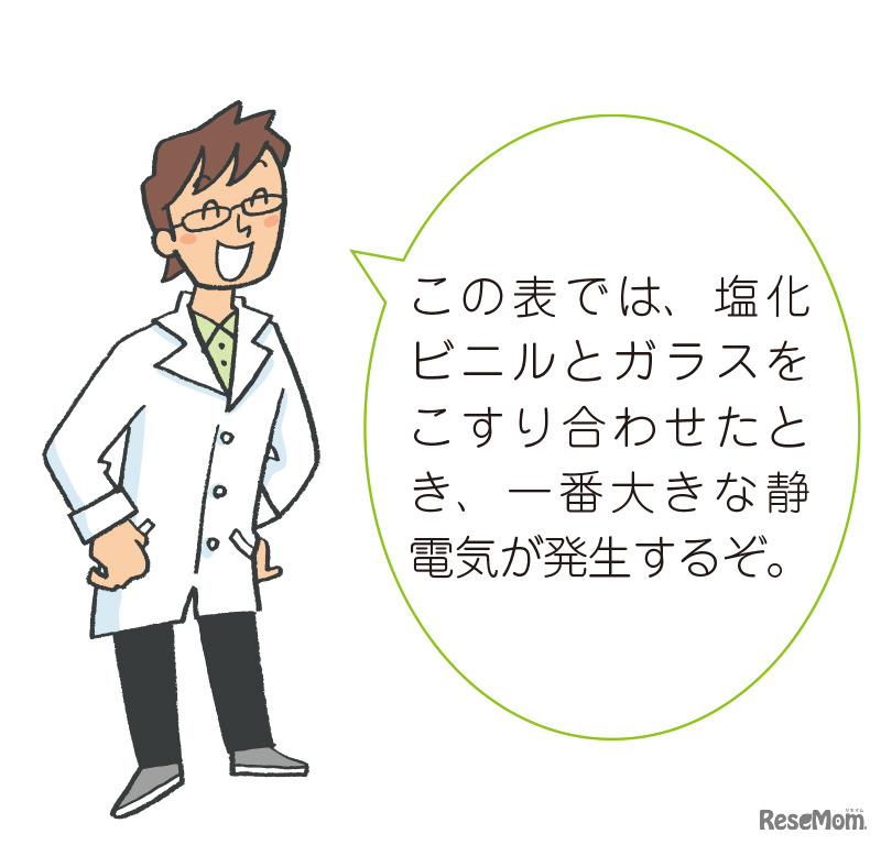 画像出典:永岡書店「自由研究 中学生の理科newチャレンジ」 プラスかマイナスに帯電しやすい物質