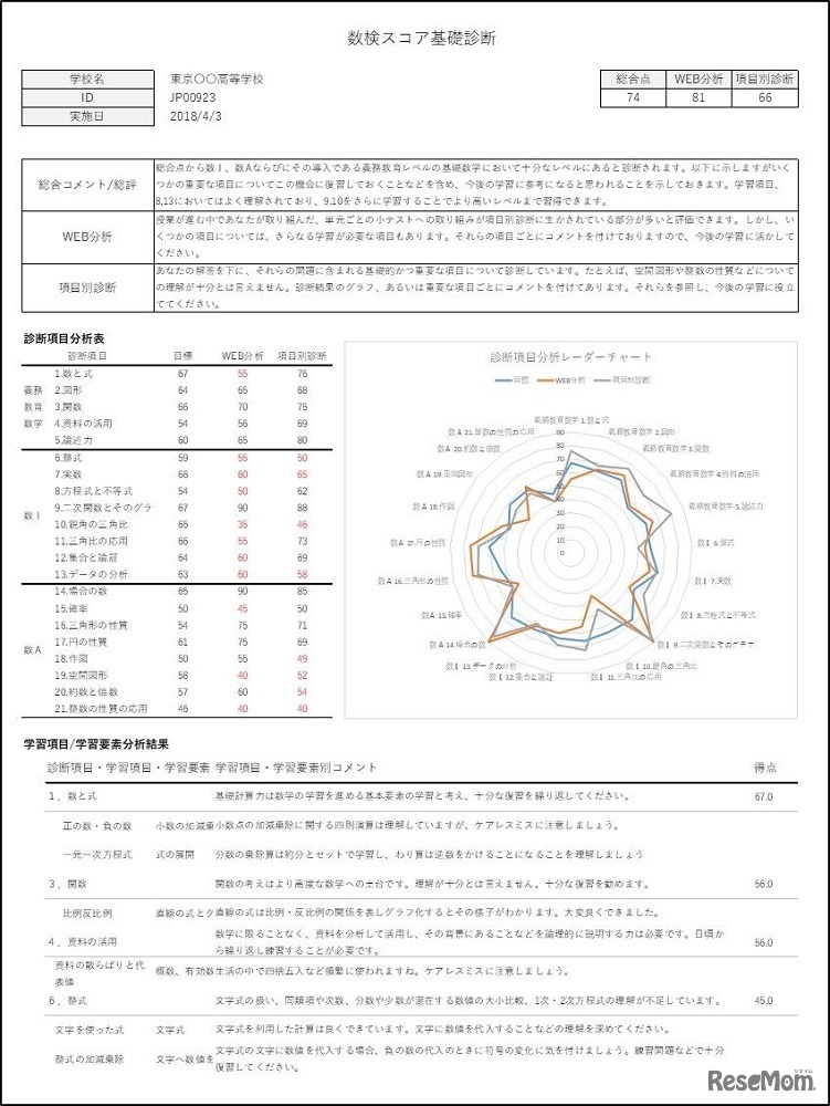 「数検スコア基礎診断」診断結果(個人)の画面サンプル
