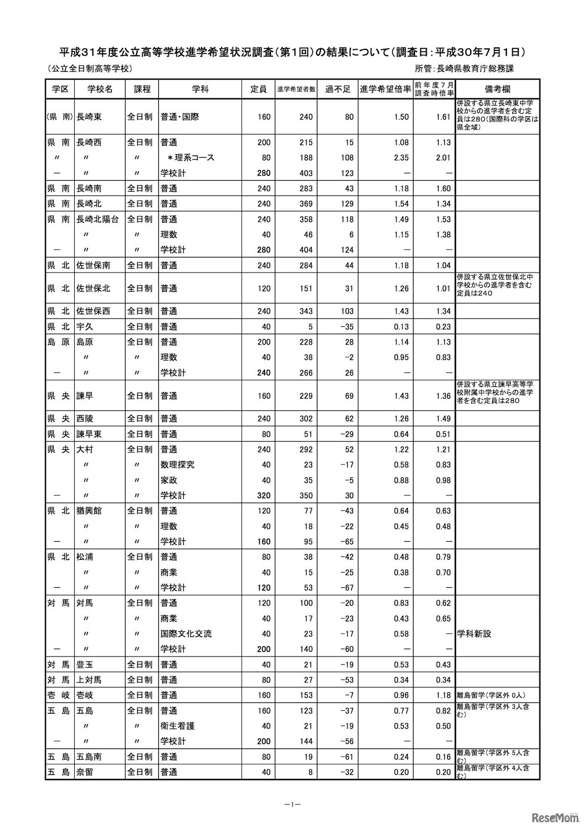 長崎県教育委員会は2018年7月19日、平成31年度(2019年度)長崎県公立高等学校進学希望状況調査(第1回)の結果について公表した。もっとも倍率が高いのは、長崎工業(機械)3.23倍。そのほか、長崎西(普通)1.08倍、長崎西(理系コース)2.35倍など。