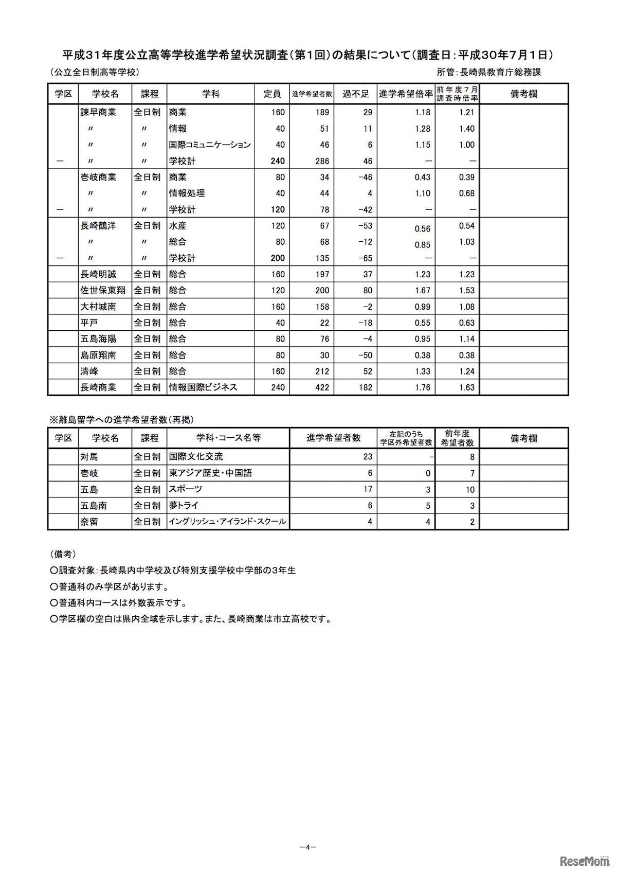 長崎県教育委員会「公立高等学校進学希望状況調査」(2019年7月1日調査分)