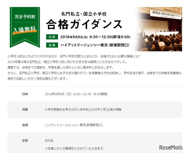 幼児教育を行う伸芽会は、2018年9月9日に「名門私立・国立小学校合格ガイダンス」を、ハイアットリージェンシー東京で開催する。対象は、2020年度入学以降の小学校受験を考える保護者で、入場無料。参加には事前予約が必要。