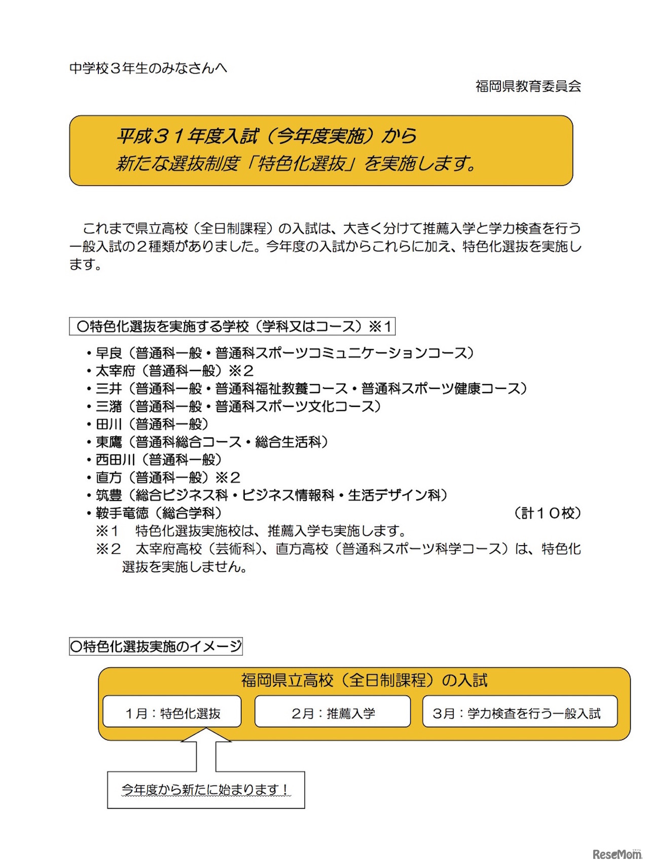 平成31年度福岡県立高等学校 特色化選抜の実施案内