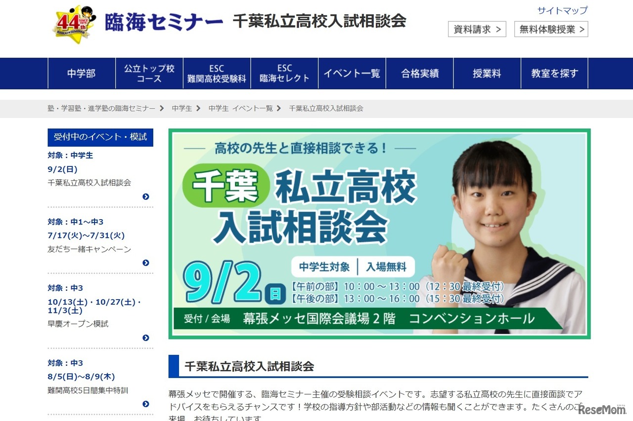 学習塾の臨海セミナーは2018年9月2日、幕張メッセにて「千葉私立高校入試相談会」を開催する。志望する私立高校の先生に直接相談し、学校の指導方針や部活動などの情報を聞くことができる。入場無料。