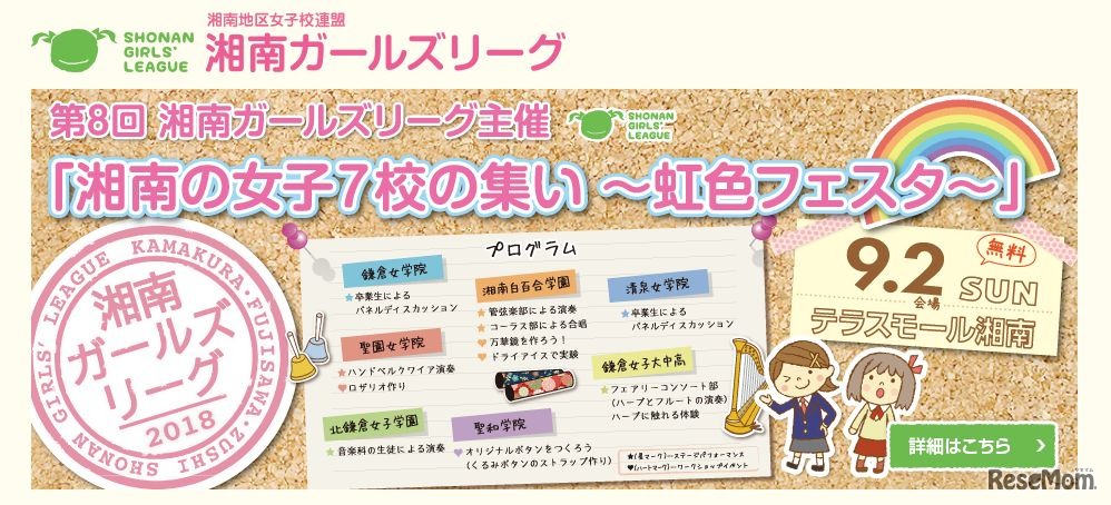 湘南地区女子校連盟(通称:湘南ガールズリーグ)は2018年9月2日、テラスモール湘南にて「湘南の女子7校の集い~虹色フェスタ~」を開催する。在校生・卒業生によるパフォーマンスやワークショップが行われ、小学生をはじめ家族で楽しめる内容となっている。