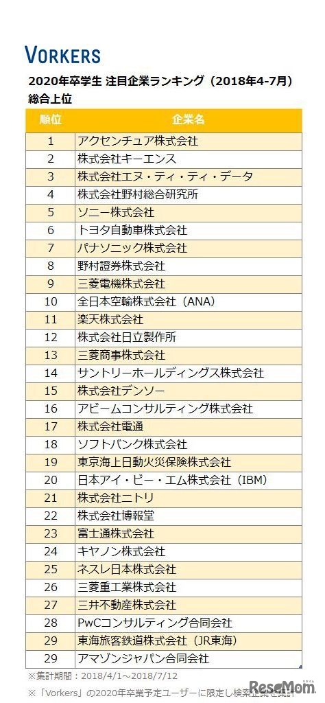 就職・転職のための企業リサーチサイト「Vorkers」を運営するヴォーカーズは、2020年卒就活生に注目した「2020年卒学生 注目企業ランキング(2018年4-7月)」を集計した。調査の結果、2020年卒就活生からの人気企業1位は「アクセンチュア」だった。