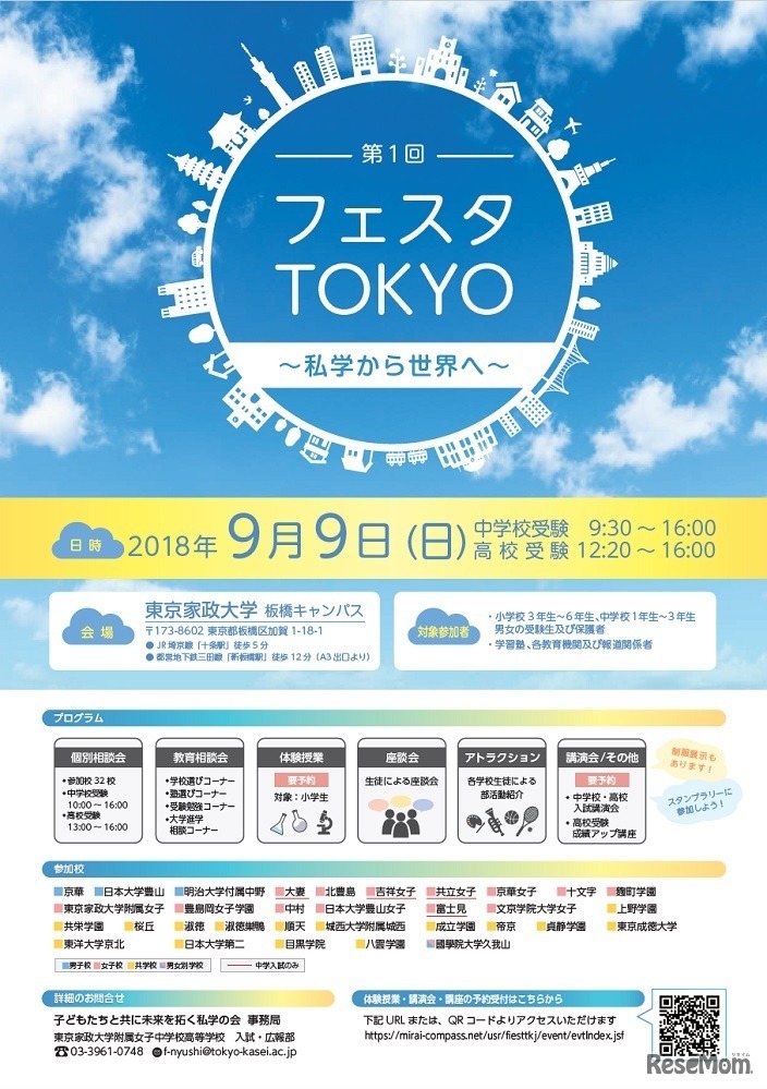 私立中学・高校32校が参加する進学相談会「第1回フェスタTOKYO」が、2018年9月9日に東京家政大学板橋キャンパスで開催される。対象は、小学3年生~6年生と中学生、保護者など。