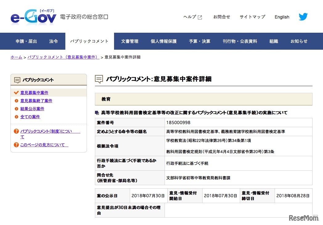 e-Gov パブリックコメント意見募集中案件「高等学校教科用図書検定基準等の改正に関するパブリックコメント(意見募集手続)の実施について」