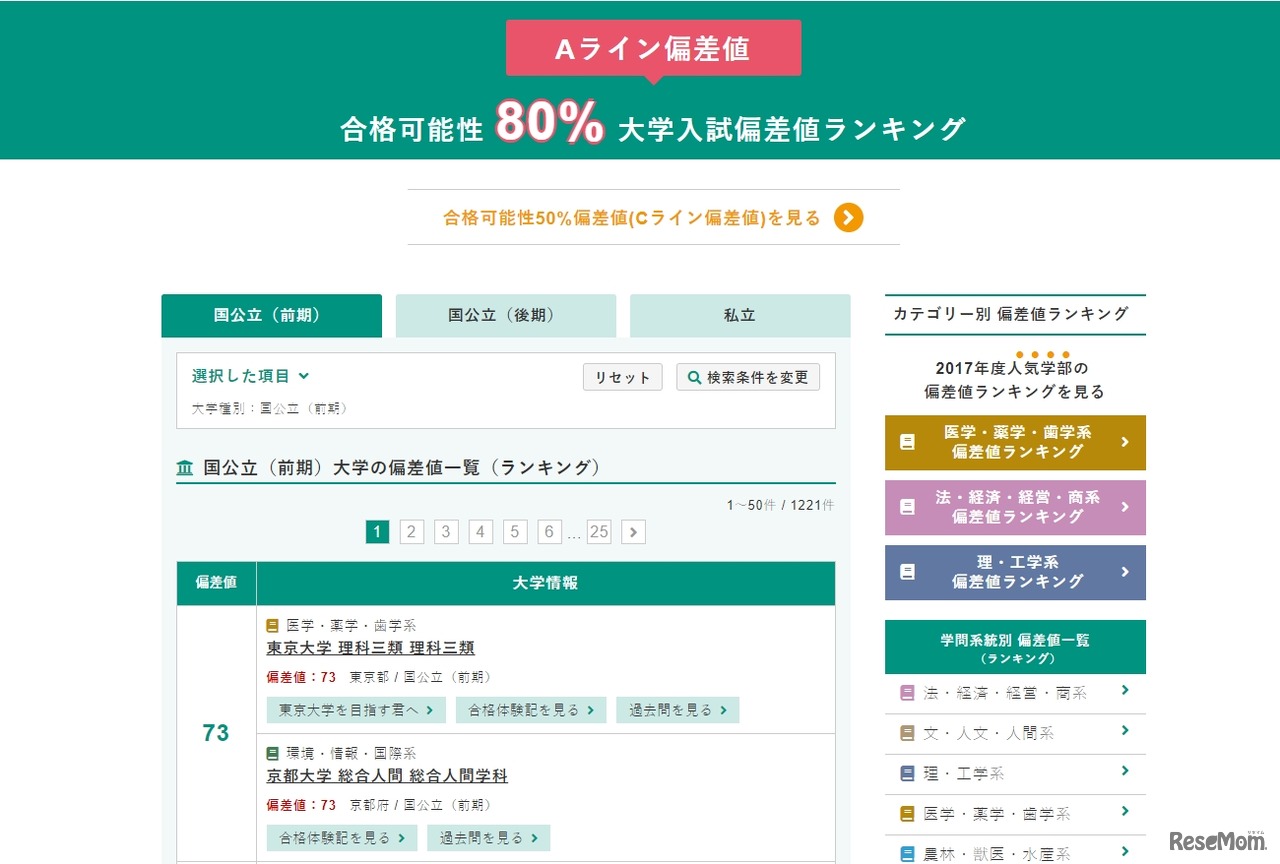 画像出典:東進ドットコム 合格可能性80%大学入試偏差値ランキング(国公立・前期)