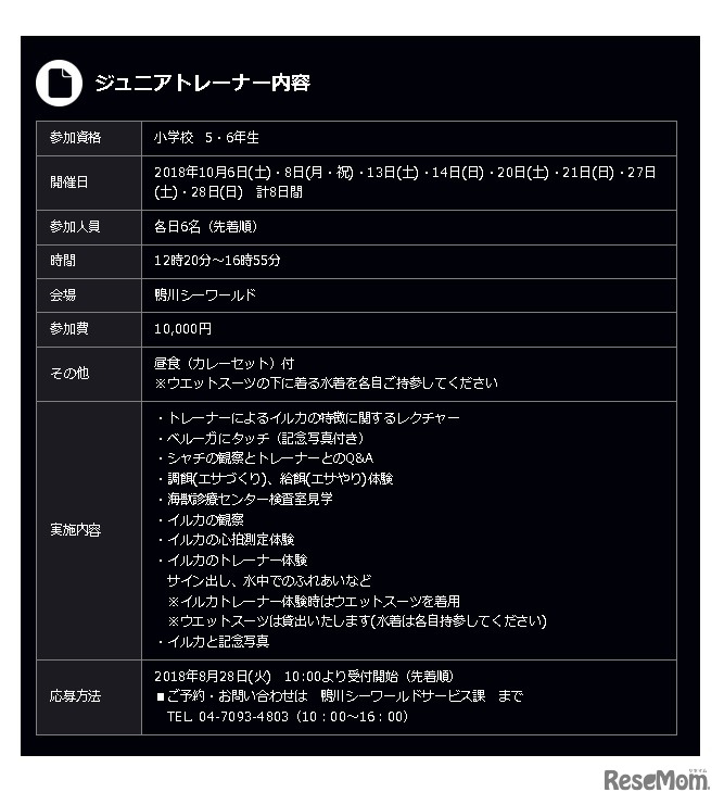 鴨川シーワールドは、小学校5・6年生を対象に「ジュニアトレーナー」を開催する。2018年10月6日~10月28日の期間中の8日間で、各日の定員は6名。8月28日より先着順で、電話による申込みを受け付けている。