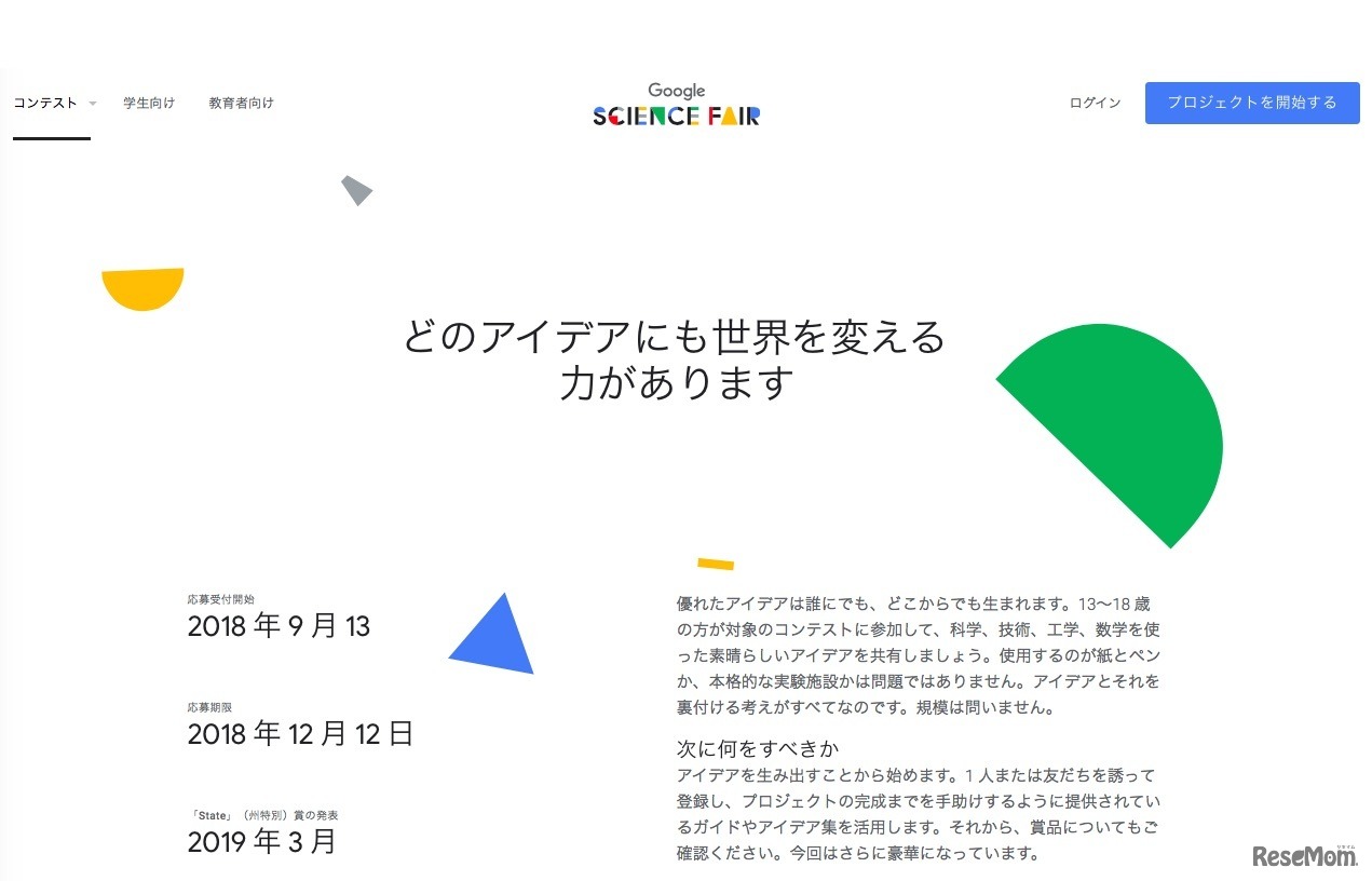 Googleが開催する「Google Science Fair」が、2018年9月13日より応募受付を開始した。13歳から18歳を対象とした問題解決の国際的なコンテストで、締切は12月13日(日本時間)。Webサイトにて、各賞の紹介や応募に役立つガイド、アイデア集などを提供している。