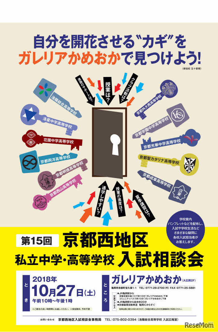 京都府私立中学高等学校連合会は2018年10月、府内の私立中学・高等学校が参加する入試相談会を開催する。京都東地区12校が参加する入試相談会は13日、西地区11校が参加する入試相談会は27日に実施。いずれも事前申込不要、入場無料。