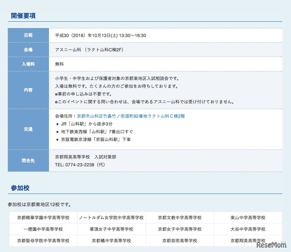 京都府私立中学高等学校連合会は2018年10月、府内の私立中学・高等学校が参加する入試相談会を開催する。京都東地区12校が参加する入試相談会は13日、西地区11校が参加する入試相談会は27日に実施。いずれも事前申込不要、入場無料。