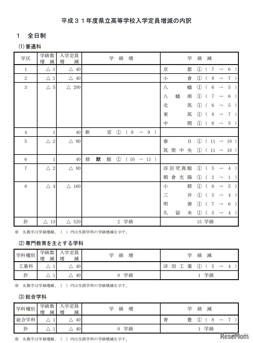福岡県は2018年9月28日、平成31年度(2019年度)福岡県立高校の入学定員を発表した。県立高校全日制は、東筑など17校で1学級減り、全体では前年度(2018年度)比600人減の2万2,360人を募集する。一般入学者選抜の学力検査実施日は2019年3月6日。