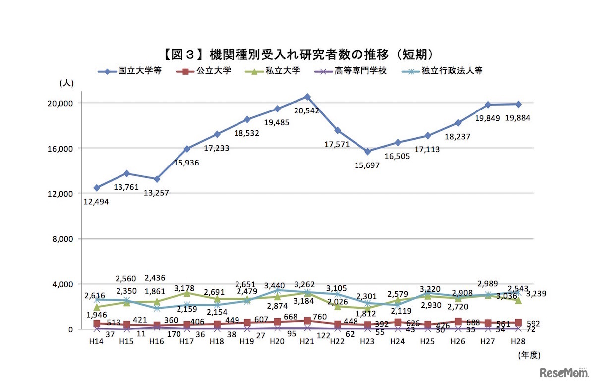 画像出典:文部科学省「国際研究交流の概況(平成28年度の状況)」 機関種別 受入れ研究者数の推移(短期)