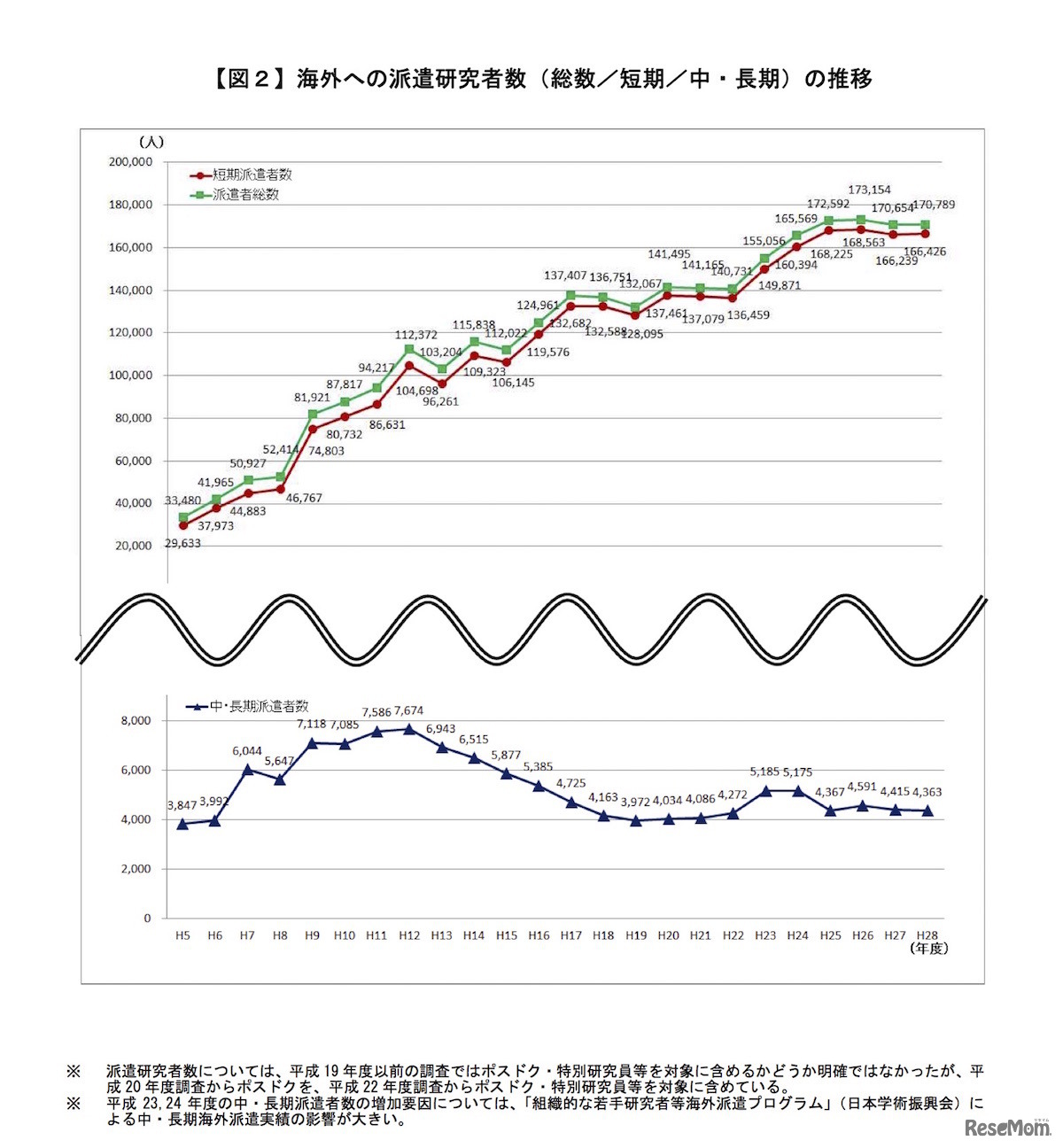 画像出典:文部科学省「国際研究交流の概況(平成28年度の状況)」 海外への派遣研究者数(総数、短期、中・長期)の推移