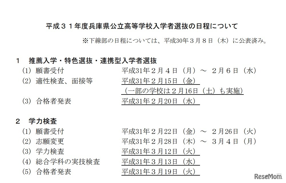 画像出典:兵庫県教育委員会「平成31年度兵庫県公立高等学校入学者選抜に関する基本方針および日程について」 2019年度兵庫県公立高校の入試日程
