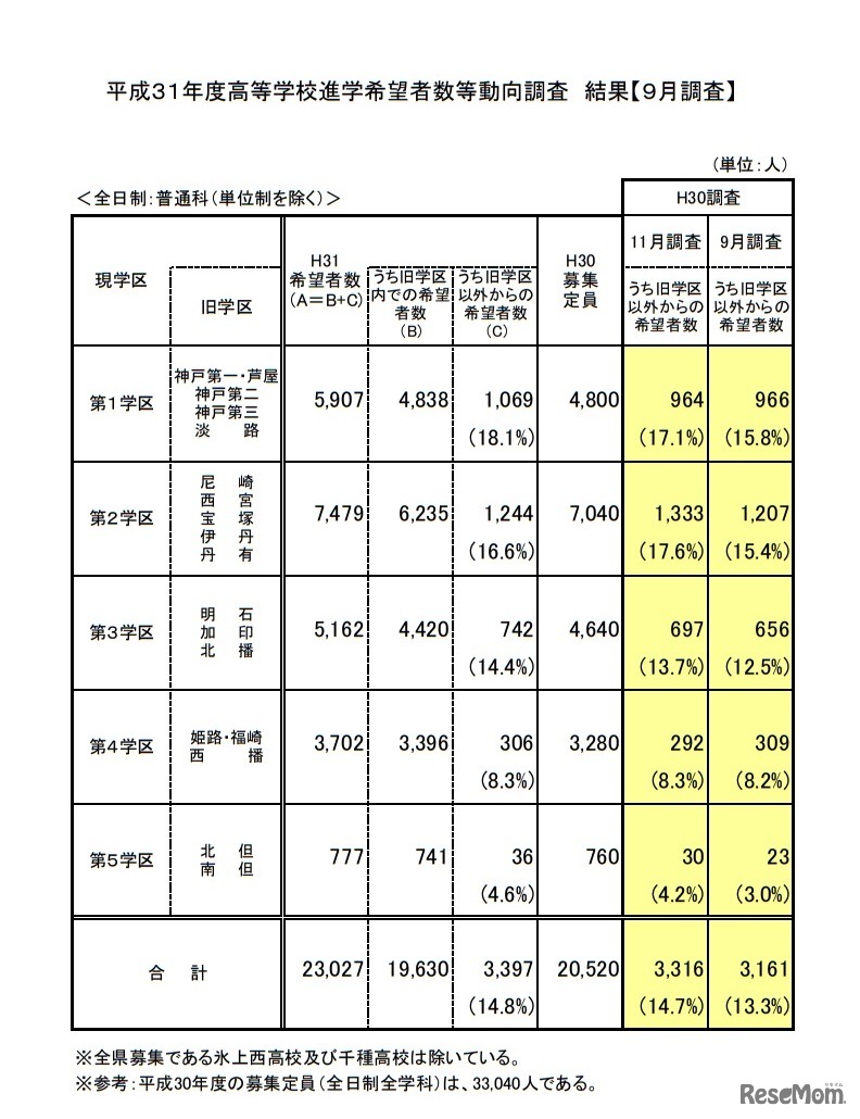 画像出典:兵庫県教育委員会「平成31年度高等学校進学希望者数等調査(H30.9月実施)」 2019年度高等学校進学希望者数等動向調査
