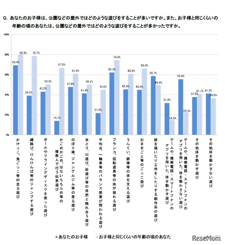 画像出典:ボーネルンド「子どもの体遊びに関する調査」 子どもの屋外での遊び方。子どもと同じ年齢のころの屋外での遊び方