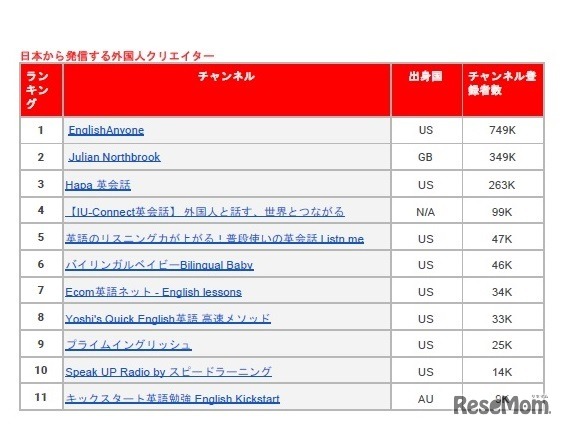 画像出典:グーグル YouTube 英会話関連チャンネル「日本から発信する外国人クリエイター」ランキング