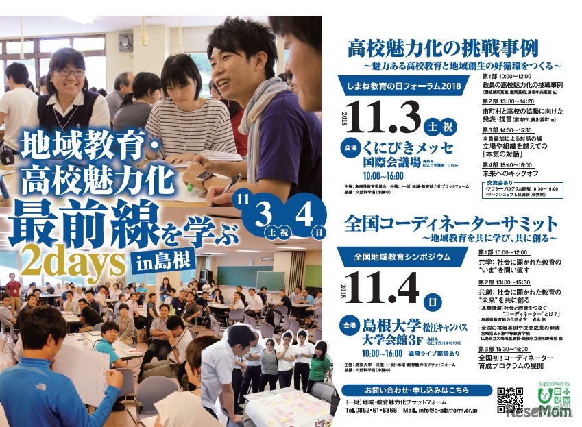 地域・教育魅力化プラットフォームは2018年11月3日・4日、全国の自治体職員、学校教職員らを対象とした「地域教育・高校魅力化の最前線を学ぶ2days」を島根県松江市で開催する。参加費は無料。Webサイトより申込みを受け付けている。