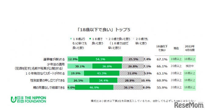 2022年4月の成人年齢引下げについて、当事者の18歳は6割以上が「賛成」していることが、日本財団「18歳意識調査」からわかった。18歳以下で適用して良いと思う内容では、「選挙権が得られる」がトップ。少年法の適用は、約3割が「もっと早くても良い」と答えた。