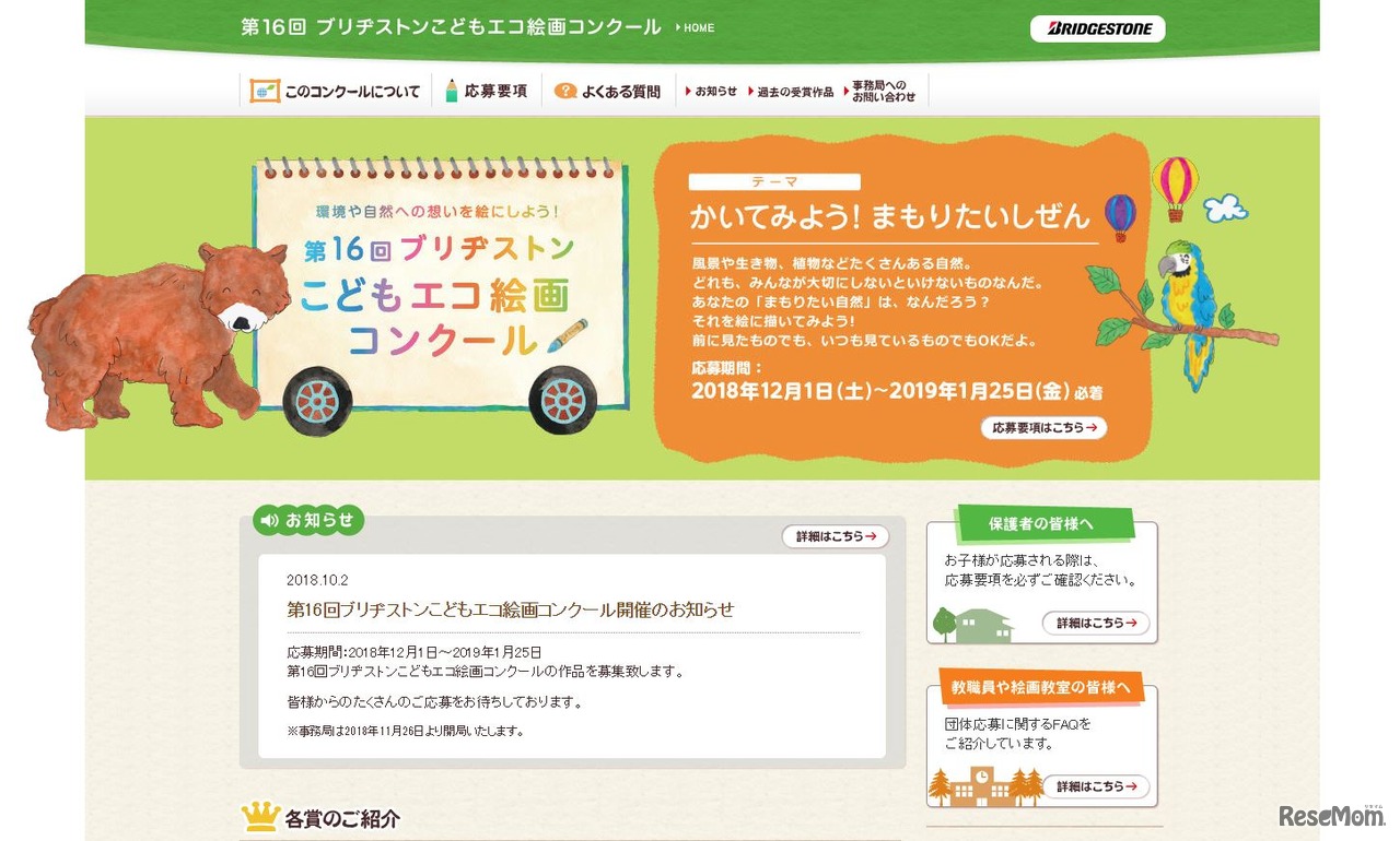 ブリヂストンは、ブリヂストンサイクルとブリヂストンスポーツと共同で、「第16回ブリヂストンこどもエコ絵画コンクール」を開催する。テーマは「かいてみよう! まもりたい しぜん」。応募期間は2018年12月1日から2019年1月25日まで。