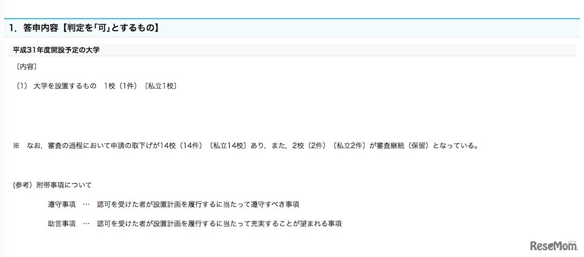 文部科学省は2018年10月5日、平成31年度(2019年度)開設予定の大学の設置に係る答申について公表。2019年度に開設される専門職大学は、専門職短期大学や専門職学科を含む17件の諮問がなされたが、認可を受けたのは高知リハビリテーション専門職大学1校のみだった。