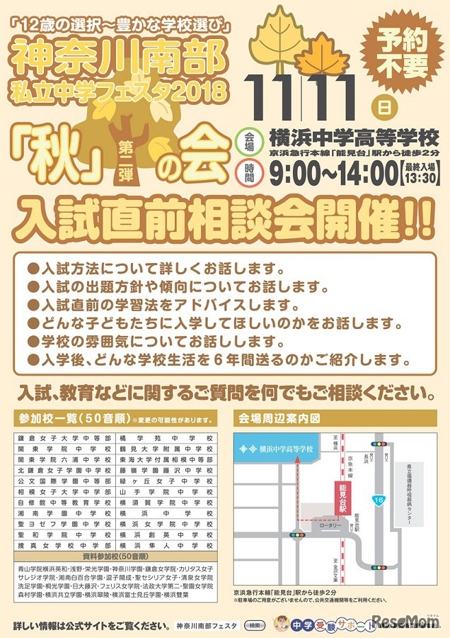 神奈川南部の私立中学校22校が参加する「神奈川南部私立中学フェスタ2018 秋の会」が2018年11月11日、横浜中学高等学校にて開催される。入試や教育などについて相談できる。入場無料。予約不要。