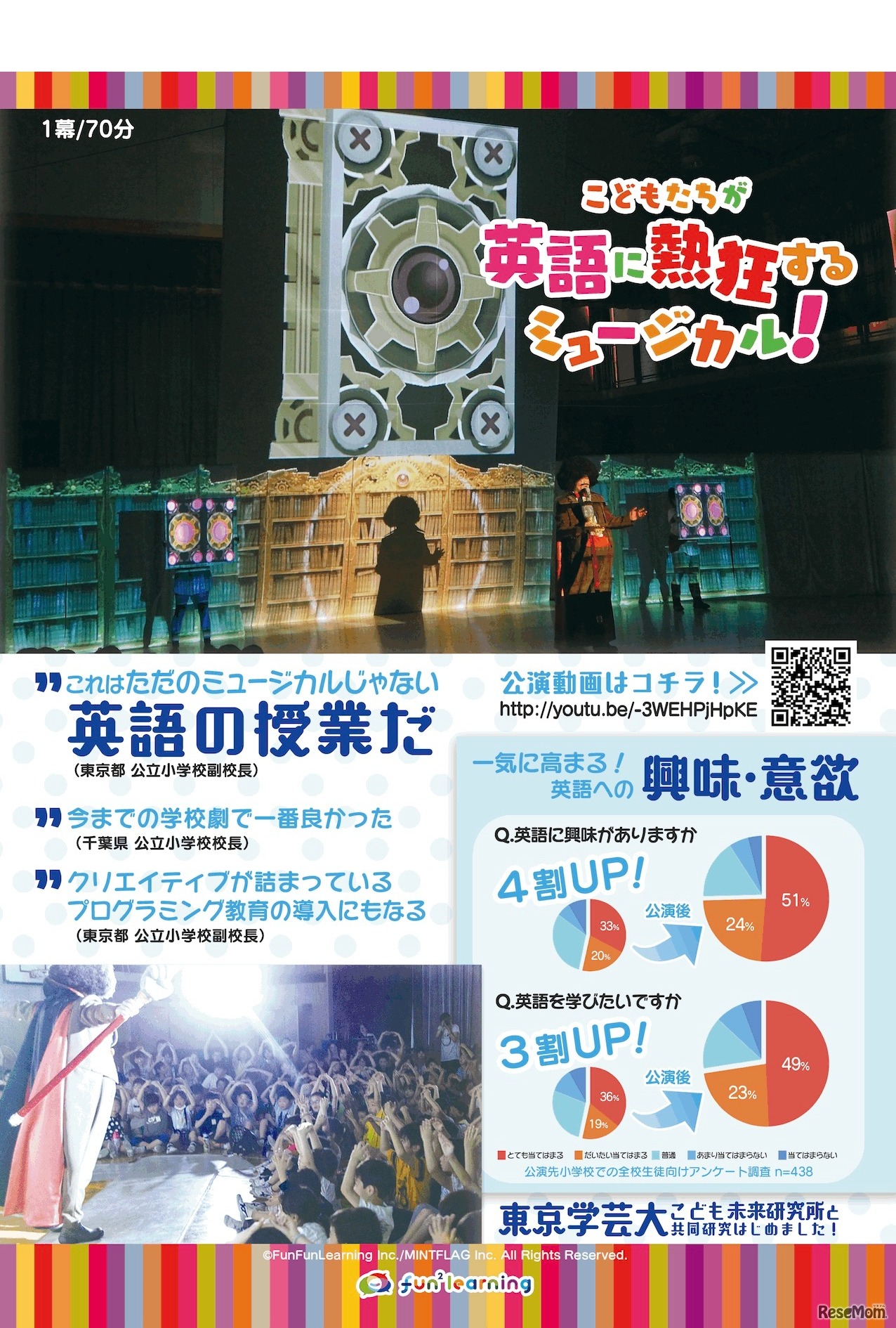 ファンファンラーニングと東京学芸大学、東京学芸大こども未来研究所は、ファンラーニング型英語学習コンテンツの産学協同研究を2018年10月18日より本格的に開始する。キックオフとして、東京学芸大学附属世田谷小学校にて英語ミュージカル公演を行う。