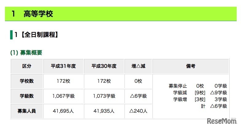 画像出典:東京都教育委員会「平成31年度東京都立高等学校等の第一学年生徒の募集人員等について」 平成31年度(2019年度)東京都立高等学校 全日制課程の募集概要