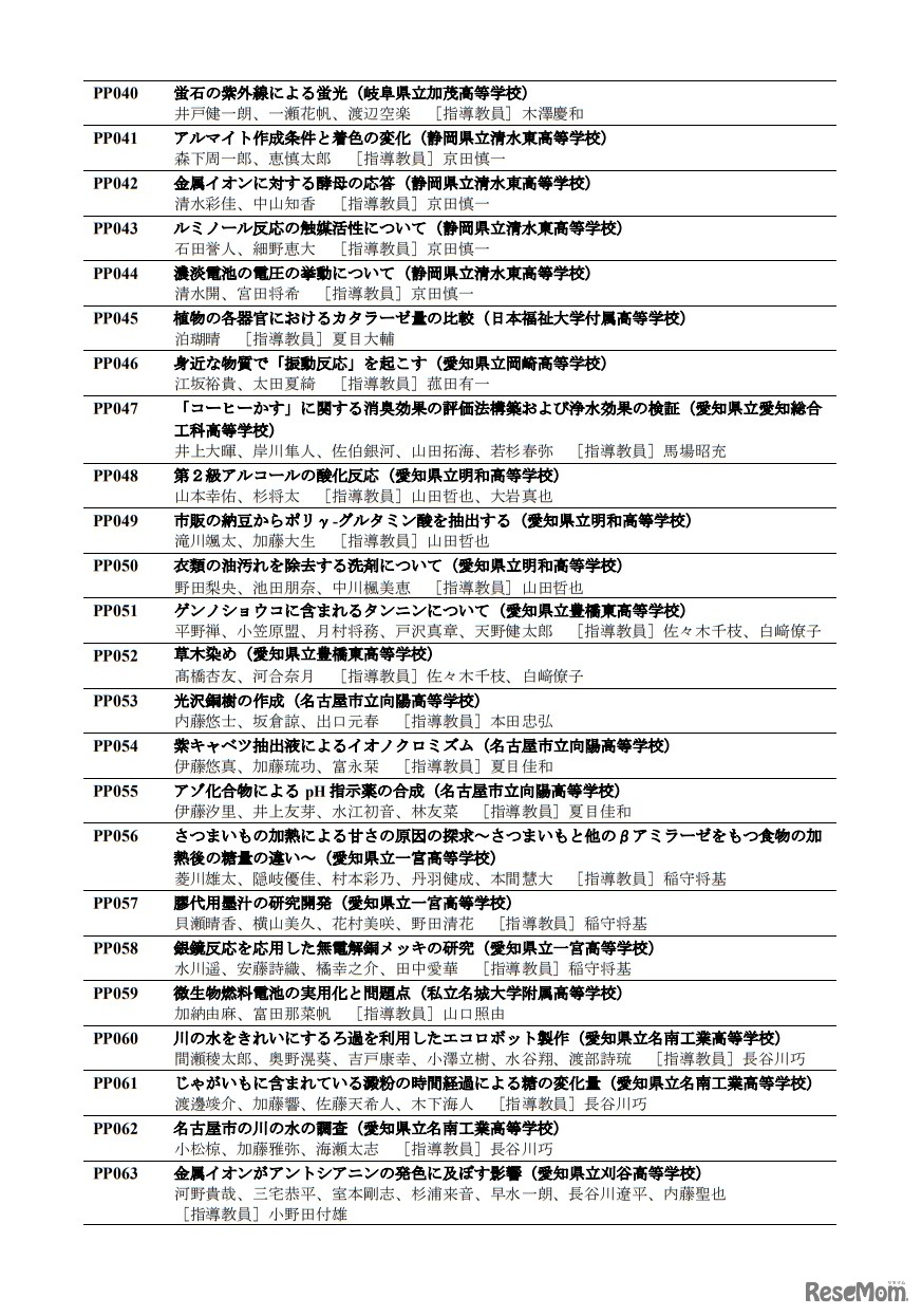 画像出典:「第15回高校化学グランドコンテスト」 「第15回高校化学グランドコンテスト」ポスター発表校・発表課題一覧