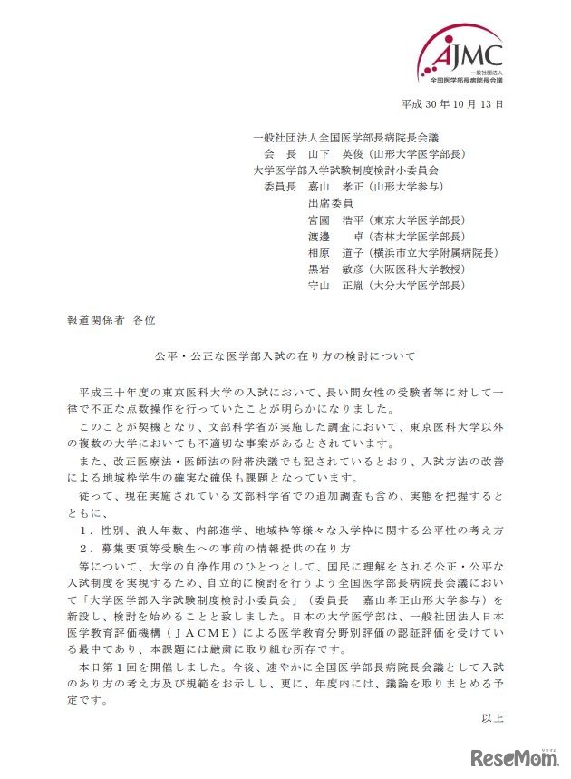 全国医学部長病院長会議(AJMC)は2018年10月13日、大学医学部入学試験制度検討小委員会を新設し、第1回会議を開催した。国民に理解をされる公正・公平な入試制度を実現するため、自立的に検討を行うのが目的。