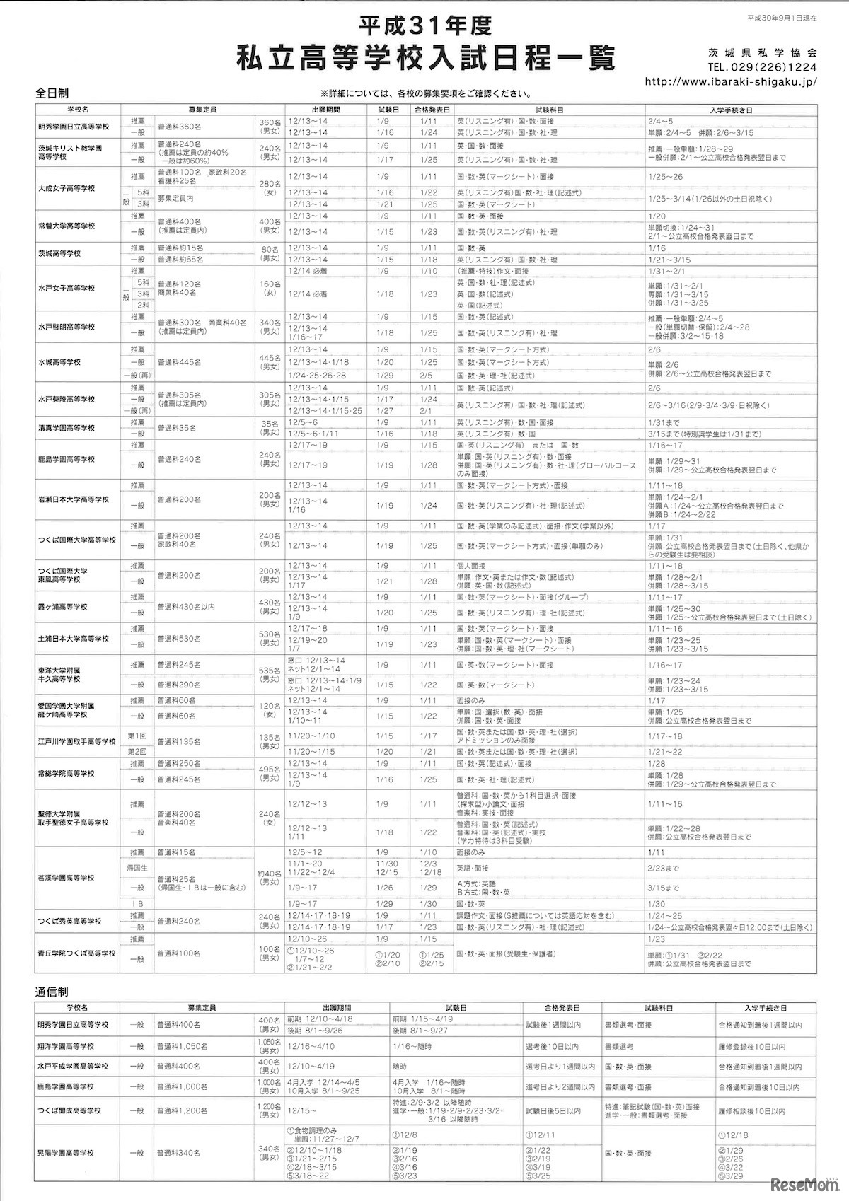 画像出典:茨城県私学協会「平成31年度私立高等学校および中学校・中等教育学校入試日程一覧」 平成31年度(2019年度)茨城県私立高等学校入試日程一覧