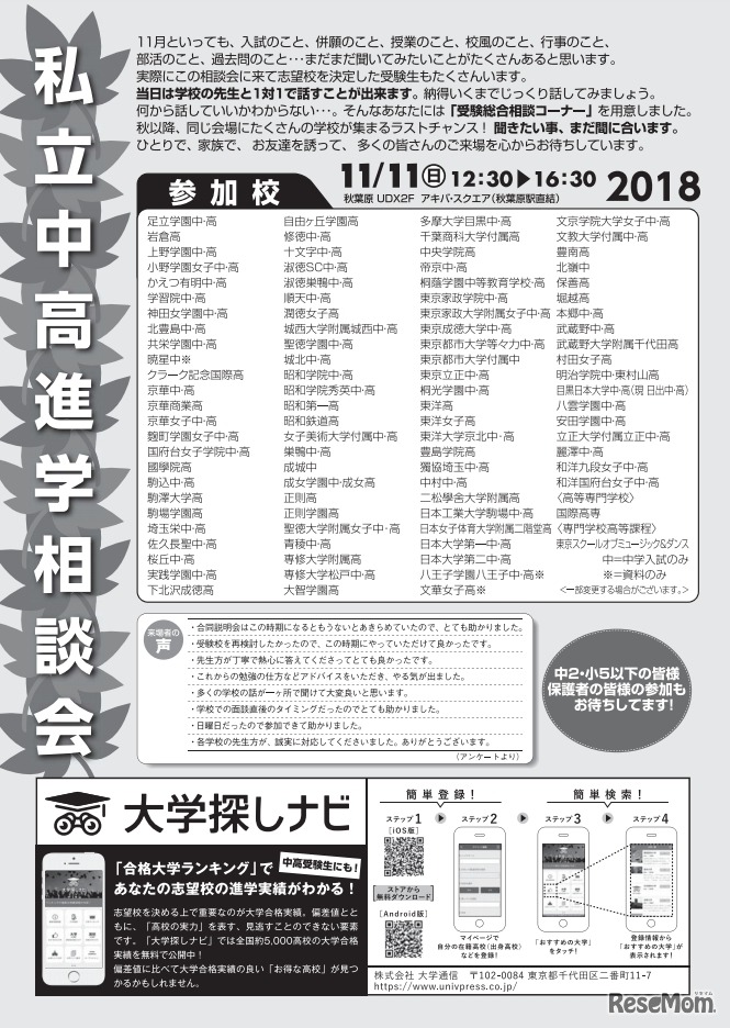 大学通信は、中学受験生・高校受験生と保護者を対象とした「2018私立中高 進学相談会 in 秋葉原UDX」を2018年11月11日にアキバ・スクエアで開催する。巣鴨中・高や東京都市大学付属中など95校が参加。入場無料、予約不要。