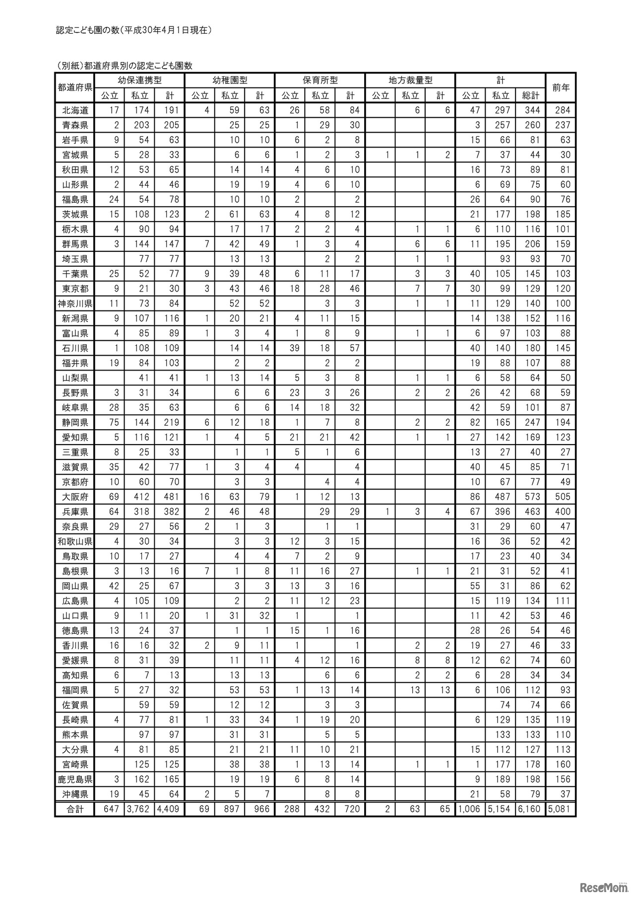 内閣府 子ども・子育て本部は2018年10月10日、「認定こども園に関する状況について(平成30年4月1日時点)」と「都道府県別の認定こども園の数の推移」を公表した。2018年4月1日時点の認定こども園の数は6,160園。平成23年(2011年)の762園から約8倍に増加している。