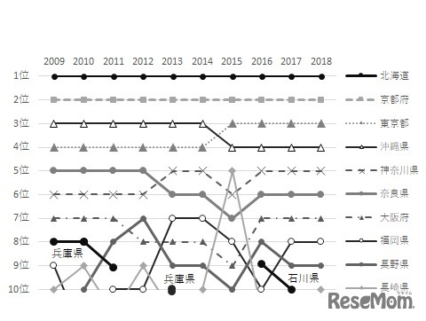 画像出典:ブランド総合研究所「地域ブランド調査2018」 都道府県魅力度ランキング上位の10年間の推移