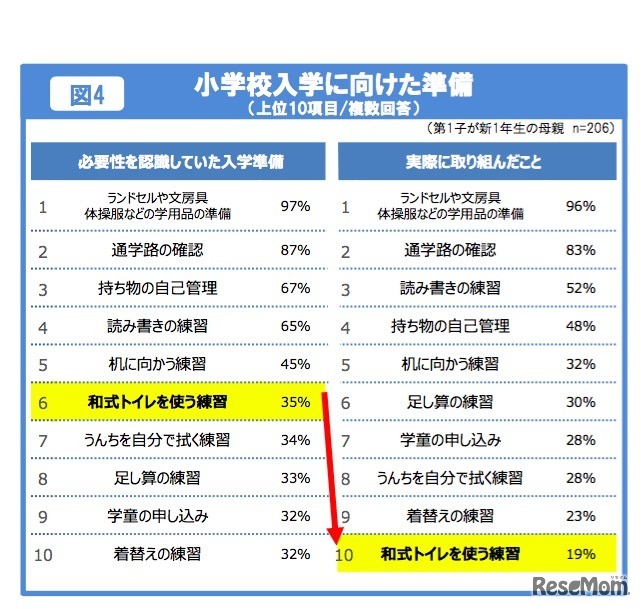 学校での排便に約6割の児童が抵抗を感じており、和式トイレが多い学校では「恥ずかしい」などの理由に加えて「和式トイレが苦手」という理由で抵抗を感じることが、小林製薬の調査からわかった。1年生の保護者の8割は入学前の練習を勧めている。