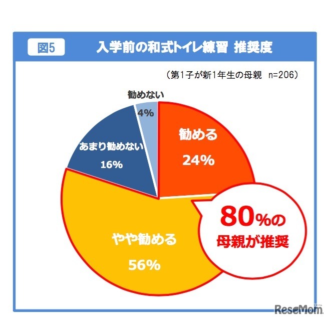 学校での排便に約6割の児童が抵抗を感じており、和式トイレが多い学校では「恥ずかしい」などの理由に加えて「和式トイレが苦手」という理由で抵抗を感じることが、小林製薬の調査からわかった。1年生の保護者の8割は入学前の練習を勧めている。