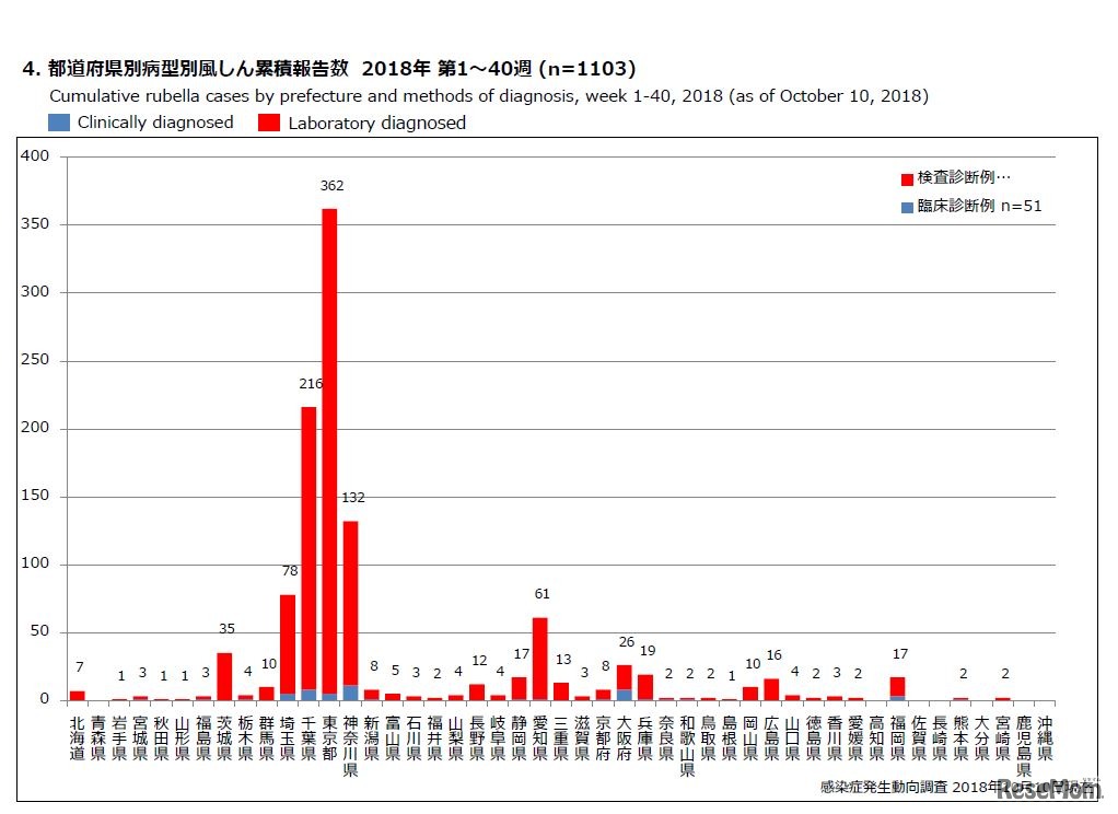 画像出典:国立感染症研究所 都道府県別病型別風しん累積報告数 2018年 第1~40週